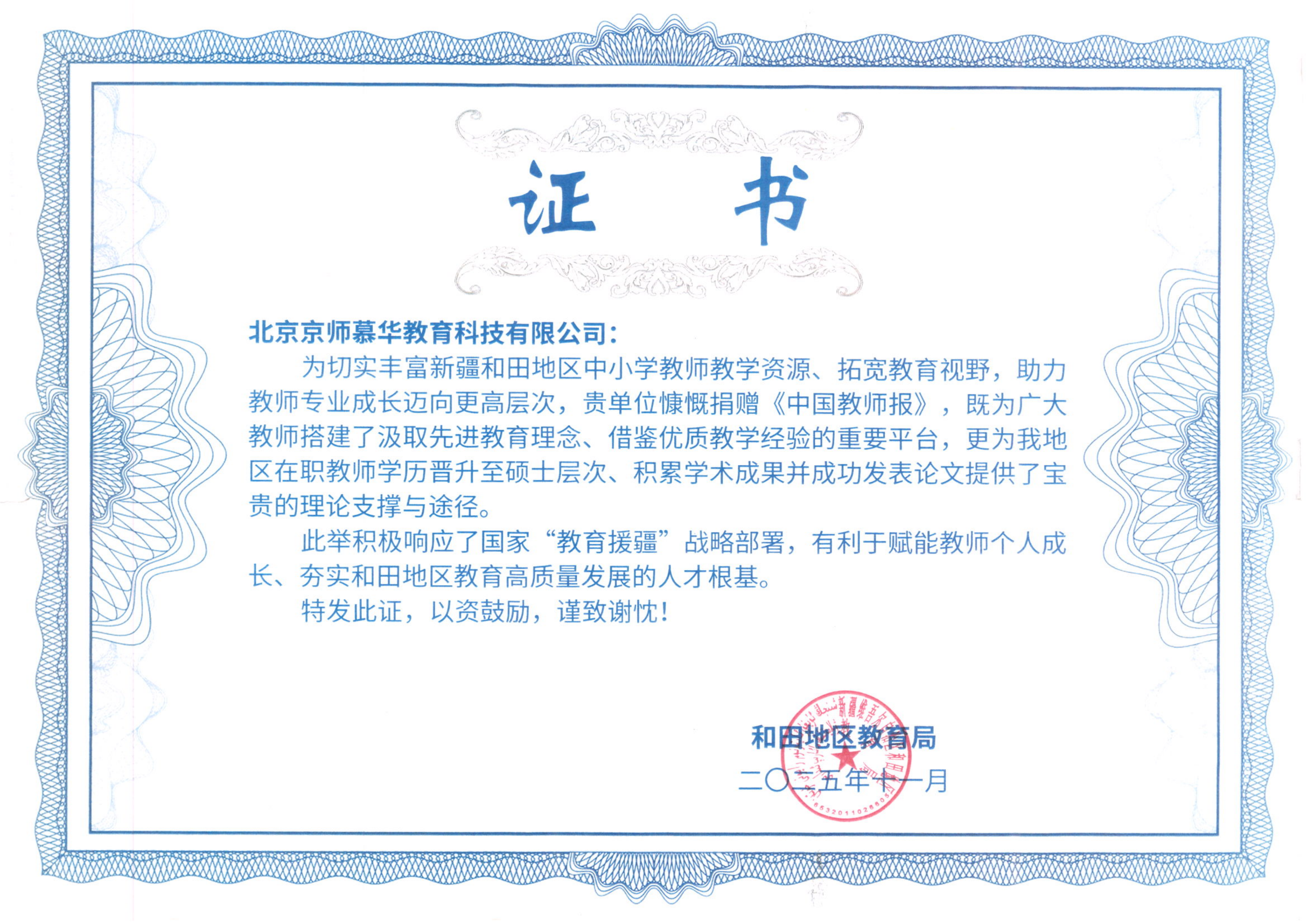 和田教育局颁发荣誉证书